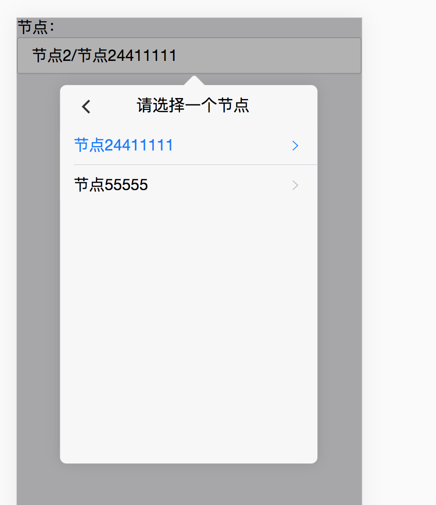 例子: mcascader的DOM不写死到js中,保留了原本组件的结构,方便你自定义组件的样式<div id="mcascaderPopover" class="mui-popover"> <div class="label"> <button type="button" id="goback" class="mui-btn mui-btn-outlined" onclick="mCascader.goBack()" > <span class="mui-icon mui-icon-back"></span></button >请选择一个节点 </div> <div id="mcascader"> <p id="noData" style="display: none">无数据</p> <ul class="mui-table-view"></ul> </div> </div> <div class="mui-input-row"> <div class="label"><a href="#mcascaderPopover"></a>节点:</div> <input type="text" id="demo" placeholder="请选择" readonly /> </div> <script src="js/mCascader.js"></script> <script> var json = [ { name: "节点1", id: "1", children: [ { name: "节点11", id: "1-1", children: [] }, { name: "节点12", id: "1-2", children: [ { name: "节点122221", id: "1-2-1", children: [] }, { name: "节点12222222", id: "1-2-2", children: [] }, ], }, { name: "节点123", id: "1-3", children: [] }, { name: "节点244", id: "1-4", children: [] }, ], }, { name: "节点2", id: "2", children: [ { name: "节点24411111", id: "2-4", children: [] }, { name: "节点55555", id: "2-7", children: [] }, ], }, ]; //存储过滤的值 mCascader({ input: "#demo", //对应input的id data: json, //mCascader 的数据 value: ["1-2-2"],//mCascader的默认值 separator: "/", //input中的分隔符 onClick: function (node) { //当选择完成时的回调函数 console.log(node); }, }); </script>
