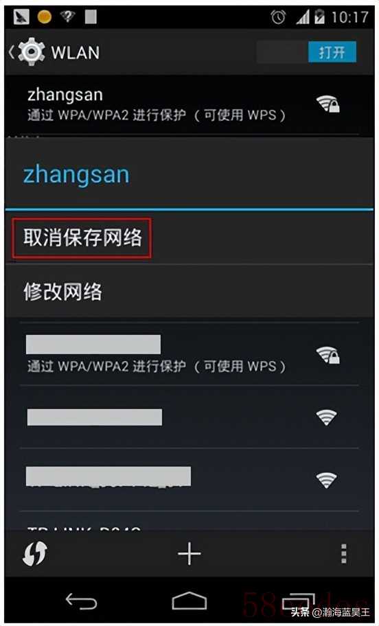 3. 确认无线信号强度终端设备距离AP过远或者中间有较多隔墙、障碍物等,导致终端接收的无线信号较弱,从而无法连接上信号。建议将终端设备靠近AP,在近距离下连接无线信号。4. 删除配置文件如果您之前修改过无线密码,但是没有修改信号名称,则终端上会保存错误的无线配置文件,导致AP无法连接,请尝试删除配置文件重新连接。设置方法:(1)安卓手机:在 WLAN 设置界面,长按需要删除的无线信号,在弹出的对话框选择 取消保存网络。如下图所示: