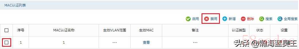 2. 关闭AC控制器MAC认证功能如果AC控制器中开启MAC地址认证功能禁用了该终端,也会导致连不上信号,建议关闭AC控制器的MAC地址认证功能。打开“认证管理>MAC认证”页面禁用MAC认证功能后尝试,如下图: