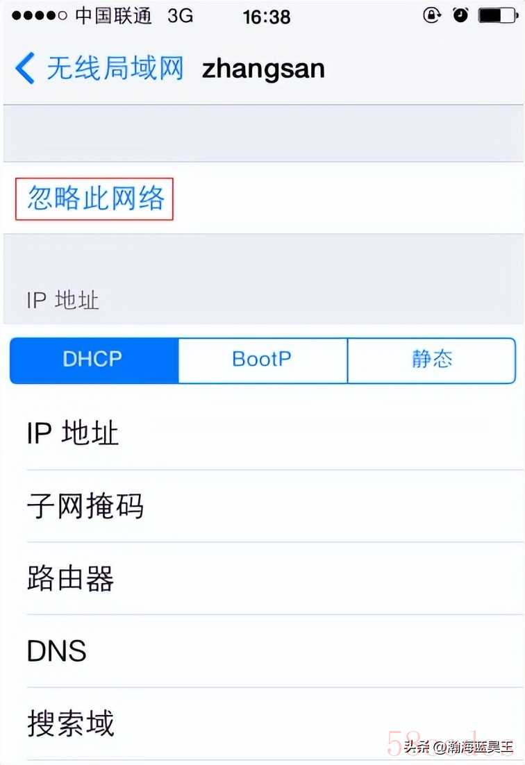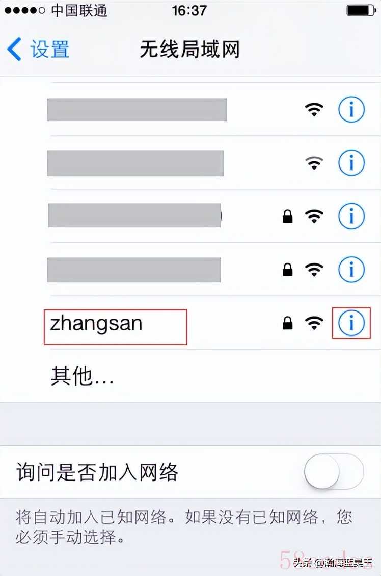 (2)苹果手机:在“无线局域网(或Wi-Fi)设置”菜单,点击对应无线信号后面显示的“蓝色感叹号”的图标,如下图所示:
