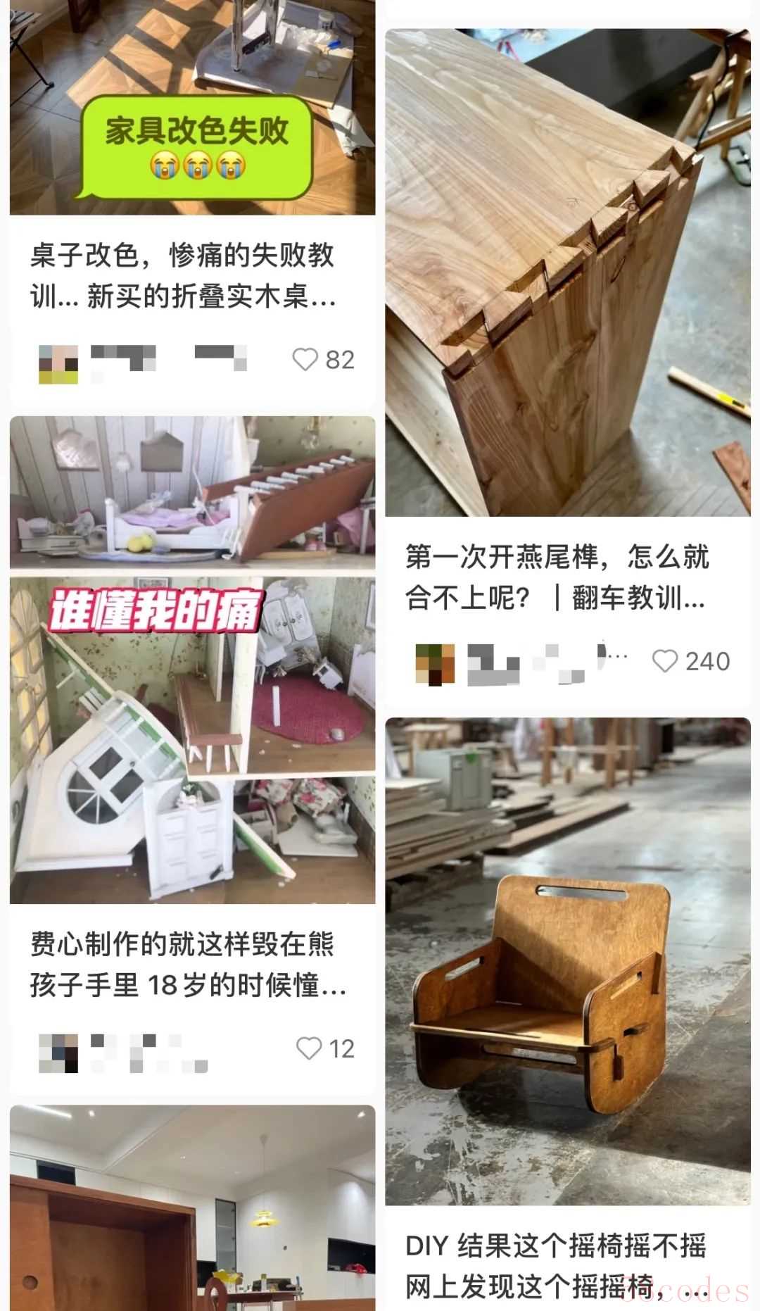 可惜 , 空间想象力不是谁都有的 。 有人 预先打 好的海 洋板接口不匹配,导致茶几的台面和桌腿 “ 各有各的想法 ”; 也有人把连接轴装错方向,做出一台只能向内 开门的柜子 ; 更容易翻车的是那些多放一盆花就会侧翻的光轴花架 …… “ DIY 失败 实录 ” 比比皆是 , “劝退 帖 ”的评论区,无数期望成为“当代鲁班”但迅速失败的网友们在进行自嘲狂欢。