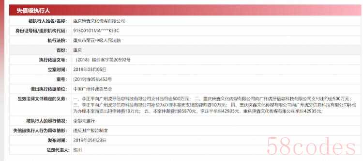 南都记者查阅中国执行信息公开网发现,2019年3月5日,中国广州仲裁委员会确定李正平向虎牙支付违约金500万元、律师费10万元、仲裁费42935元,庚鑫文化向虎牙支付违约金500万元、律师费10万元和仲裁费42935元,但由于被执行人全部未履行,庚鑫文化被列为失信被执行人。而庚鑫文化即为渝万公会主体公司。
