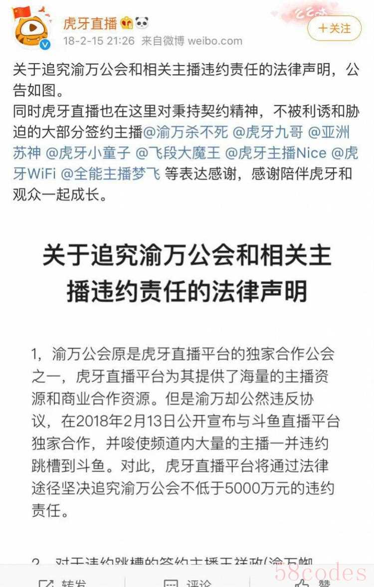 虎牙还在其官方微博发布声明,声称渝万公会作为虎牙的独家合作公会之一,“公然违反协议,并唆使频道内大量的主播一并违约跳槽到斗鱼,”对此,虎牙宣布将通过法律途径坚决追究渝万公会不低于5000万元的违约责任,还将对违约跳槽的签约主播王祥政(渝万蜘蛛)追究不低于500万元的违约责任。
