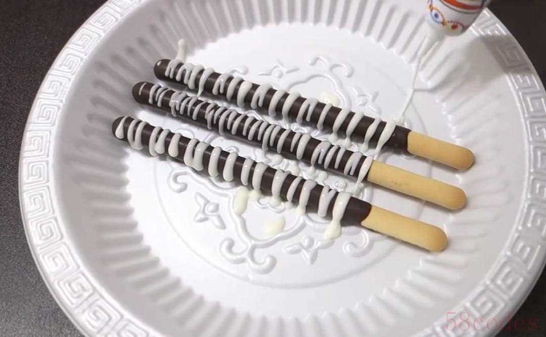 3. 取一根饼干,均匀地淋上巧克力酱(如动图所示)