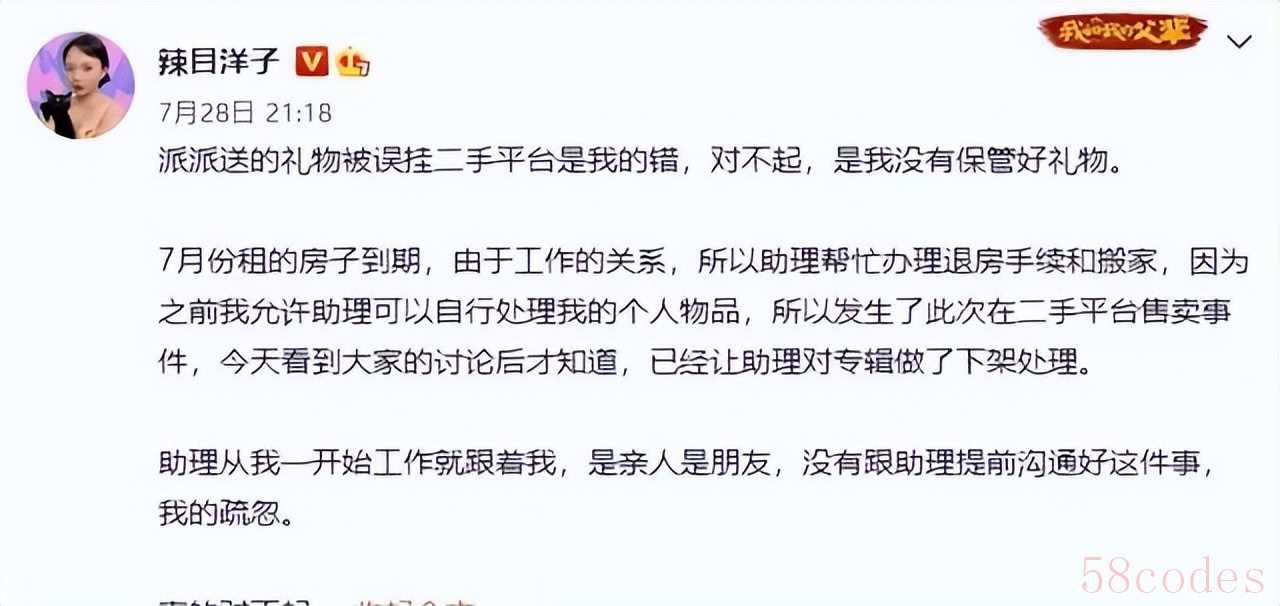 事情上了热搜后,辣目洋子晚上在社交平台上发声回应,称:“助理帮忙办理退房手续和搬家,因为之前我允许助理可以自行处理我的个人物品,所以发生了此次在二手平台售卖事件。”并表示已下架了相关物品。