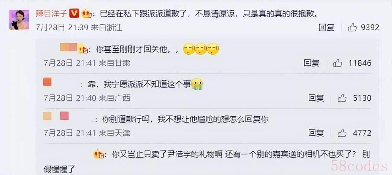 她还在留言处表示,私下已经跟尹浩宇(派派是他昵称)道歉了,不恳请原谅,只是觉得真的很抱歉。但是这个发声却没有得到一些网友的认可,有网友觉得她不单单是卖了尹浩宇的礼物,还有一个别的嘉宾送的相机也被卖了,推到助手头上更没诚意。 还有网友发现,辣目洋子居然才刚刚回关尹浩宇。