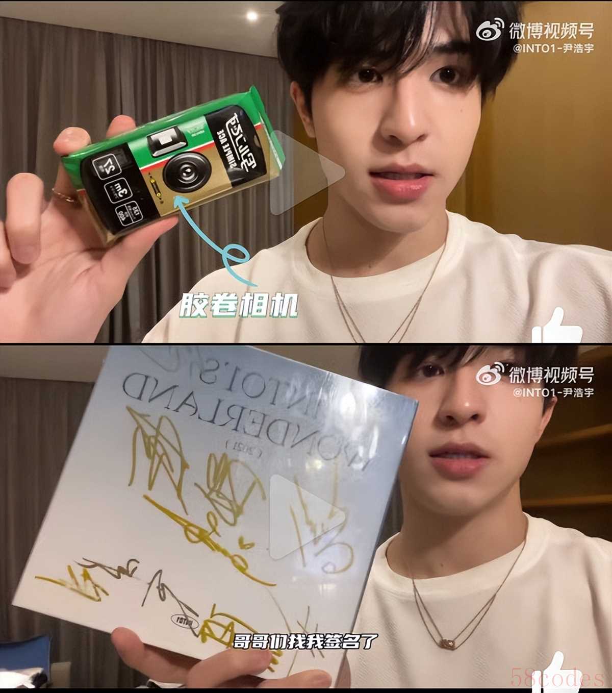 从网友晒的信息看,尹浩宇当时去录制节目前,特意挑选了礼物送给一同参加的嘉宾。礼物准备得很用心,是胶卷相机和INTO1实体专辑,专辑上面还有全体成员的签名。