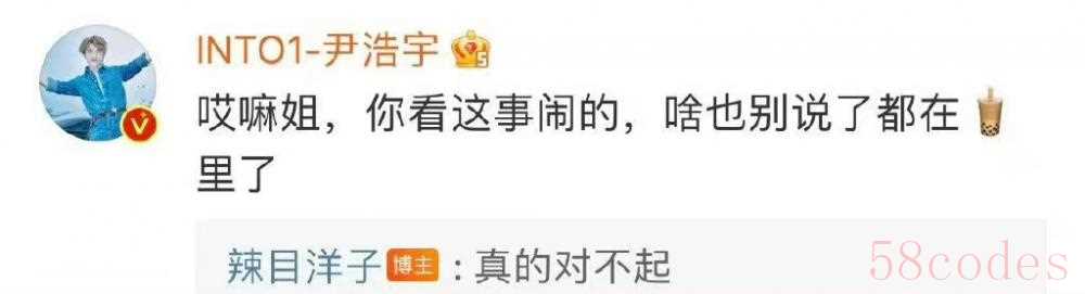 辣目洋子发文道歉后,很快,尹浩宇在辣目洋子道歉博文下回应,并没有在意此事,原谅了辣目洋子。