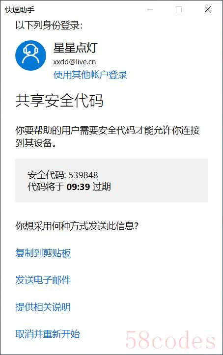 9.将看到一个必须与接受帮助的人共享的六位数字代码。你可以在窗口中选择一个选项(例如电子邮件)将此数字代码通知受帮助的人。