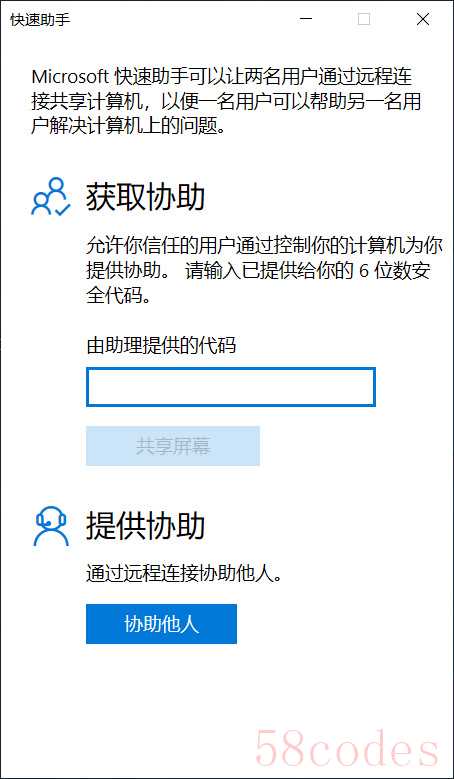 4.在“获取协助”部分看到一个“由助理提供的代码”输入框。