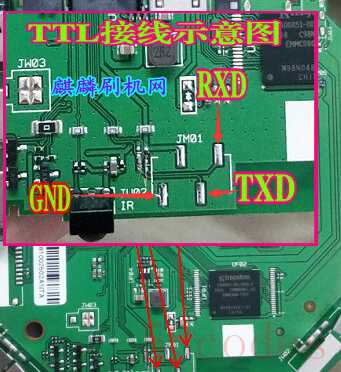 请参见特写图,将 TTL 线焊接到触点上。 请看主板左侧的TTL接口。