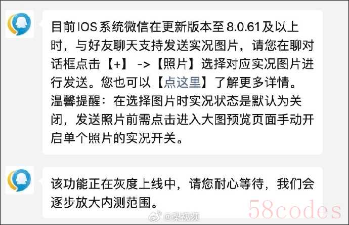 今年7月,有苹果用户发现微信聊天能发实况照片:之前一直吐槽不能发实况,这次终于可以了,微信还是听劝的。