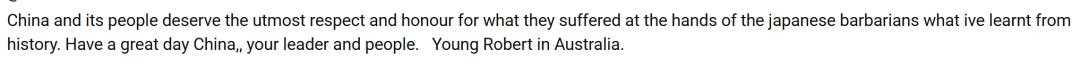 中国及其人民理应得到最崇高的尊重与敬意,因为他们曾遭受过日本人的野蛮残害,这是我从历史中所了解到的。