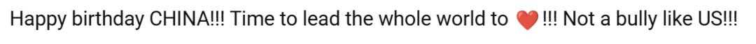 “中国生日快乐!是时候把世界引领向和平了,而不是像美国那样引导霸凌!!!”(这位老外似乎是误以为今天是国庆...)