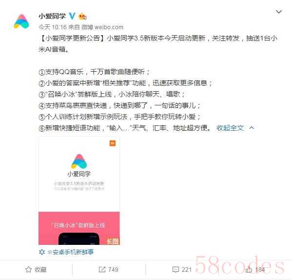 除此之外,在小米AIoT开发者大会上,小米人工智能及云平台副总裁崔宝秋在介绍小爱同学的AI技术和发展战略时,宣布了小爱同学的一项新技能:召唤微软小冰。而昨天12月4日上午,小米小爱同学官方微博发布公告表示小爱同学3. 5 新版本今天启动更新,更新之后将支持QQ音乐曲库,并且还有"召唤小冰"功能上线。
