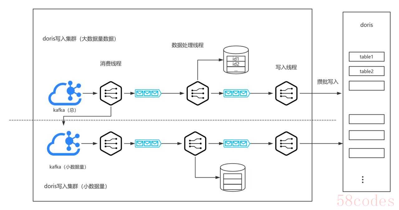 经过多年的发展,云信已积累了大量数据源,不同的数据源分别写入 Doris 中对应一张表,提升 Doris 写入吞吐的关键在于提高攒批,而 Stream Load 仅支持单表批量数据写入,大量的数据源将造成写入服务为每个数据源分别攒批,导致内存消耗大。为解决这一问题,我们尝试使用 HashMap 作为底层集合进行数据聚合,但在多线程环境下会引发哈希冲突。于是改用数组作为底层集合进行批量聚合,成功避免了哈希冲突,并支持进程内横向扩展线程数,可有效提升数据处理的能力。但若 Doris 端出现波动或业务量激增,写入端仍可能面临压力。 虽然通过扩容可以提升整体吞吐量,但可能导致数据分散,降低批量聚合效果。例如,原本可以聚合 1000 条数据一次性发送,现在可能只能聚合 100 条,增加了 Doris 数据处理的压力。为此,我们进一步优化,将同一数据源的数据集中在一个写入集群内处理,非本集群的数据则投递到其他 Topic,由对应集群进行消费。这种方式提升了批量聚合能力,缓解了写入过程中小文件过多的问题,从而降低了 Doris Compaction 的压力。在数据格式上,将原本的 JSON 格式改为 CSV,并结合 GZIP 压缩,显著降低了带宽和内存的消耗。最终,经过这些优化,线上写入峰值已达 600 万 QPS,集群总写入带宽最大达到 11GB/s,稳定控制在实际可承受范围内,整体运行非常平稳。