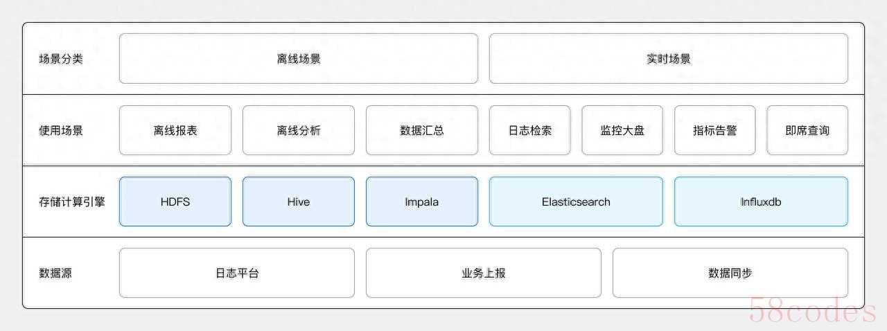 如上图云信数据平台早期架构,IM、RTC、短信、直播、点播等业务数据通过主动上报、日志采集,数据同步等方式上报至数据平台中。数据平台通过流式数据清洗或批处理对数据进行结构化或半结构化计算,并将结果存储到对应的存储计算引擎中,最终服务于多种使用场景。离线场景下,主要采用 Hadoop 生态的 HDFS、Hive 以及 Impala 进行数据存储与分析;实时日志检索场景中,主要使用 Elasticsearch;而监控类数据则主要存储于 InfluxDB。该架构存在三大痛点:- 存储冗余: 原有架构为了满足不同场景的数据查询分析需求,数据存储在 InfluxDB、Elasticsearch 和 Hive 多个组件中,同一数据冗余存储,造成存储资源严重浪费。