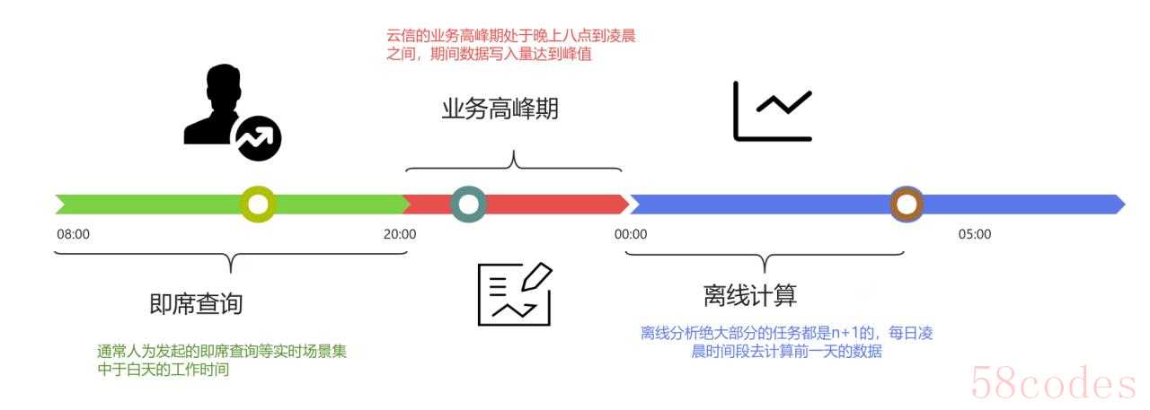 同时,借助 Doris 冷热分层能力,进一步优化了存储成本。之前使用 Hive 处理半结构化数据时,由于采用 HDD 存储且缺乏索引,查询效率较低。现在切换到 Doris 之后,前一天的数据存储在 SSD 上并构建了索引,离线分析效率显著高于原先 HDFS + Hive 组合。此外,通过合并离线和在线集群和分时段资源调度机制,我们实现了计算资源的高效利用。白天(开发人员活跃期)集中承载数据查询分析需求,晚高峰时段(20:00-00:00)则全力支持云信业务峰值写入。离线计算任务通常安排在凌晨(00:00 之后)进行,用于处理前一天的数据(即 T+1 模式)。这种机制确保了从日间到夜间的计算能力全覆盖,使计算资源全天候高效运转,大幅提升了资源利用率。