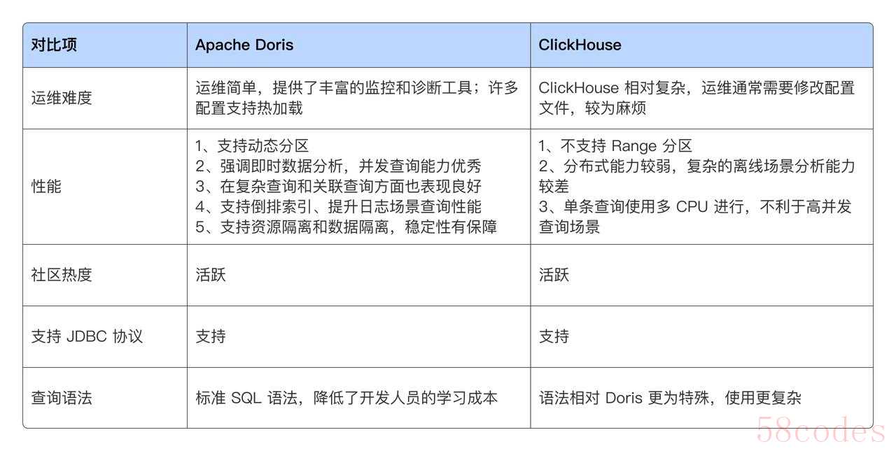 调研 Doris 的同时,我们也关注到了 ClickHouse,两个系统的关键点对比如下。