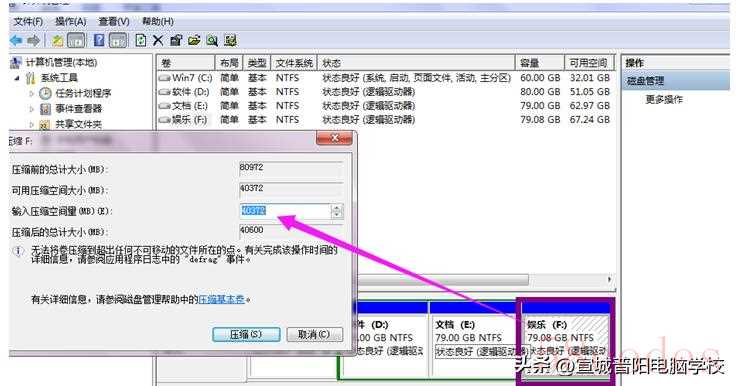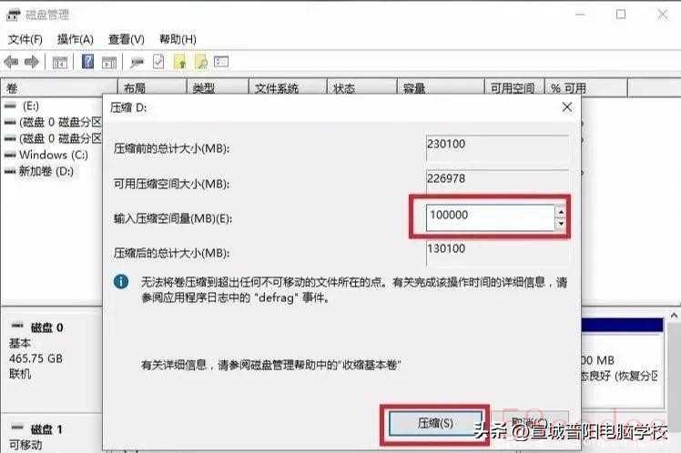 5. "输入你想压缩的空间大小" (比如分100G,就写100GB),点“压缩”。