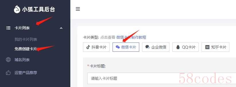 2、点击卡片列表(免费创建卡片)选择卡片类型——微信卡片,根据页面提示,填写相应信息,创建卡片,先选择不开启跳转。
