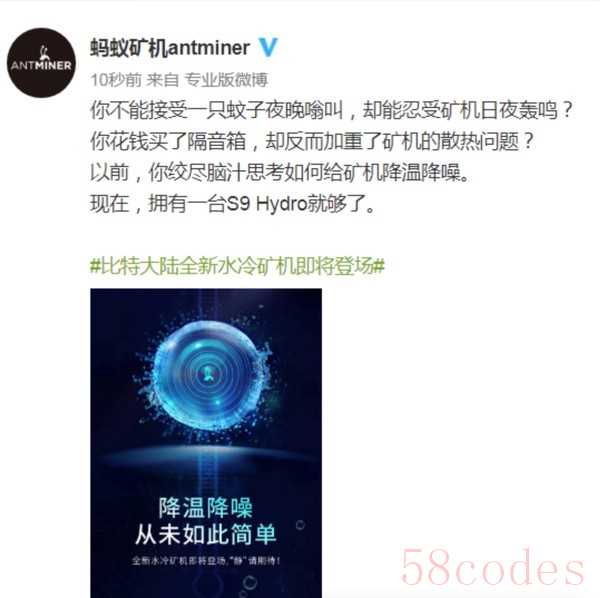【手机中国新闻】对于矿工而言,一台好的矿机无异于直接提高了生产力,使得整体赚钱的速度成倍增长。今天,比特大陆旗下的蚂蚁矿机似乎又要再度带来全新生产力的矿机。据蚂蚁矿机官方微博最新放出的消息显示,其将于近期推出一款水冷矿机,型号为S9 hydro。但有关这台新品矿机的售价及核心参数目前仍未收到相关的官方消息。可根据微博原文来看,此次的新品重点解决的将会是矿机在挖矿过程中由于散热所产生的噪音问题。