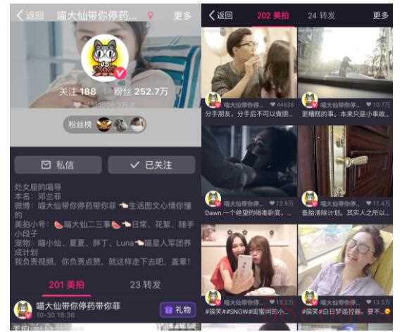 “明明可以靠脸吃饭,但却偏偏要靠才华”的美拍百万级达人“喵大仙”在今年9月一举夺下美拍月度新榜原创作者影响力排行榜第一,作为美拍较早一批成长起来的达人,喵大仙以在美拍发布简单有趣的小视频而走红,她的原创视频以段子为主,有时她会扮演英俊呆萌的小伙子,有时是怪里怪气的算命先生,有时是时尚美丽的女神......在精心编排的内容、巧妙的剪辑手法下,一个个极富创意的短视频走入人们的视线,喵大仙也收获了诸多粉丝和关注。