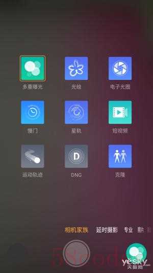 在相机主界面,下方依次罗列着相机家族、延时摄影、专业、照片、视频、慢动作、全景其中拍摄模式,很容易识别。但是显得不够简洁,毕竟平时一般使用最多的还是自动拍照模式和录像模式,其余的其实是可以整合到一个集合里。而相继家族就聚合了多重曝光、光绘、电子光圈、慢门、星轨、短视频、运动轨迹、DNG、克隆相机等很多有趣的拍照模式。