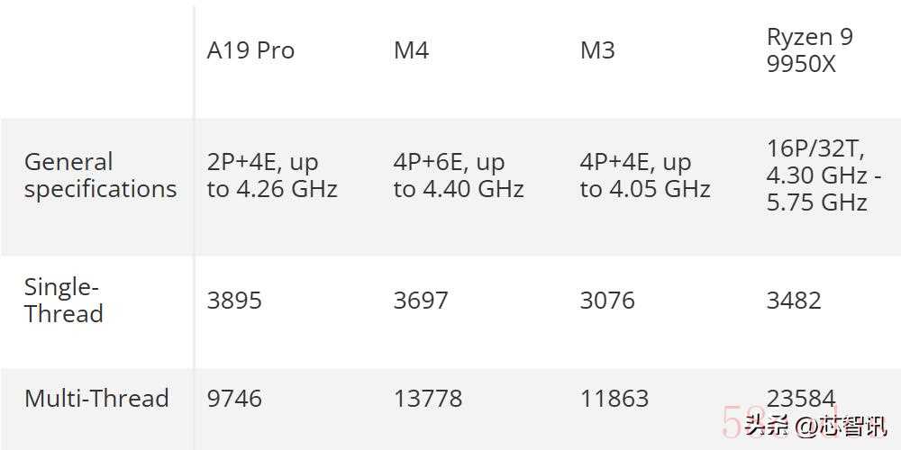 CPU性能提升11%-12%A19 Pro拥有6个CPU核心,其中包括:两个高性能内核,运行频率高达 4.26 GHz(相比上代提升6.5%),并具有改进的分支预测(在分支繁重的工作负载下性能更高、能效更高)和增加的前端带宽(这意味着每周期指令数更高,但并不表明内核每周期可以解码多少条指令);四个节能效核,与前代产品相比,其最后一级缓存增加了 50%。最新的测试显示,全新的A19 Pro处理器在 Geekbench 6 基准测试中,CPU单线程性能得分3895,比上一代产品高出 11%,比高通的骁龙 8 Elite 高出 36%,并且超越了苹果自家的 M4(高出 5.3%)和 AMD 强大的锐龙 9 9950X(高出 11.8%)。不过,由于只有6个CPU核心,因此在多线程性能得分为 9746 分,仅比 A18 Pro 高出 12%。所以,这款智能手机 SoC 在多线程工作负载方面仍然无法击败台式机和笔记本电脑的 CPU。