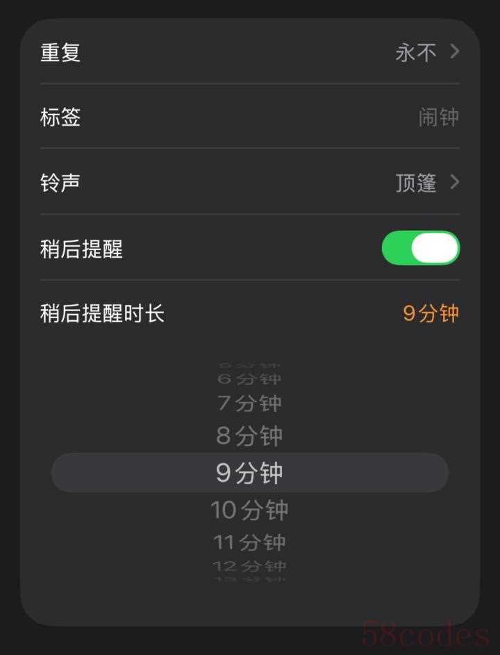 此外,iOS26的闹钟开启稍后提醒,可以自由选择稍后提醒时长(1-15分钟)。