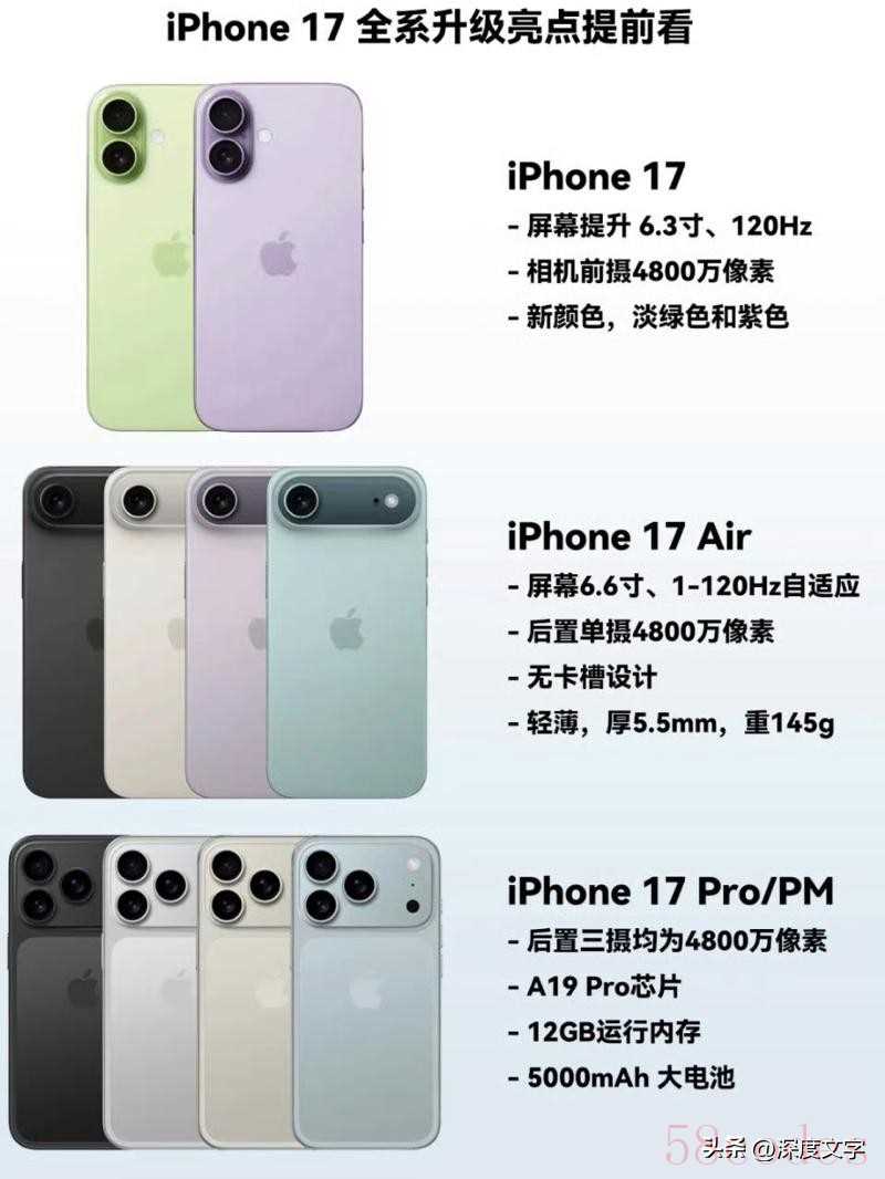 苹果对iPhone17产品线进行了重大调整,取消了Plus版本,引入了全新的iPhone 17 Air1。这款新机型机身厚度仅5.5mm,刷新了苹果的历史纪录,重量约为145克。