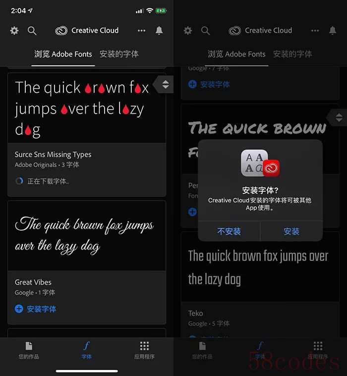 3、安装完成之后,在「Adobe Creative Cloud」软件中可以看到一安装字体列表,也可以前往 iPhone 的「设置」-「通用」-「字体」中查看字体。