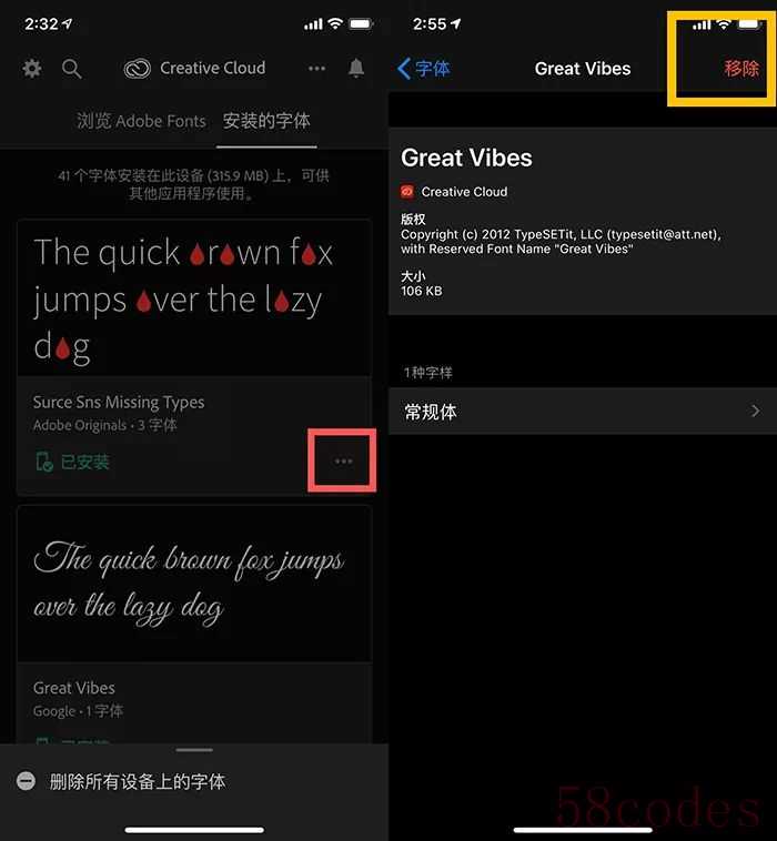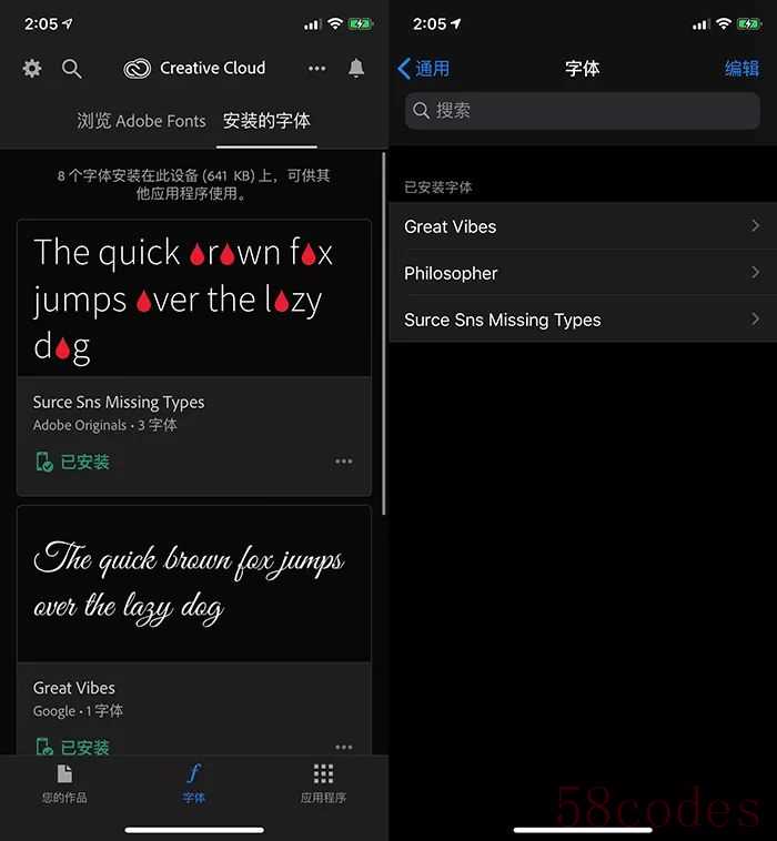 如果你不喜欢这个字体了,删除也是很简单的,在「设置」-「通用」-「字体」中进行删除,还可以在「Adobe Creative Cloud」软件的已安装字体列表中进行删除。