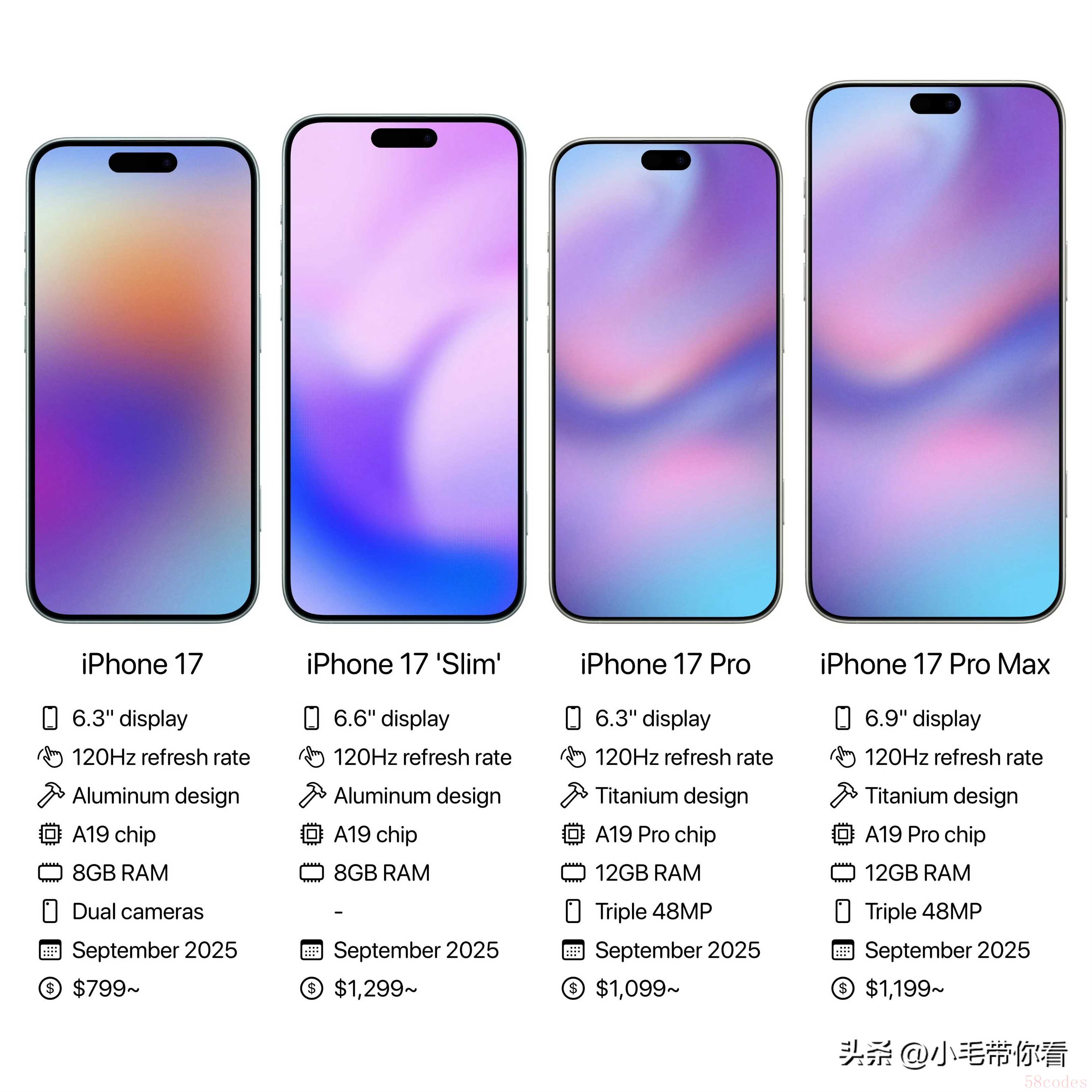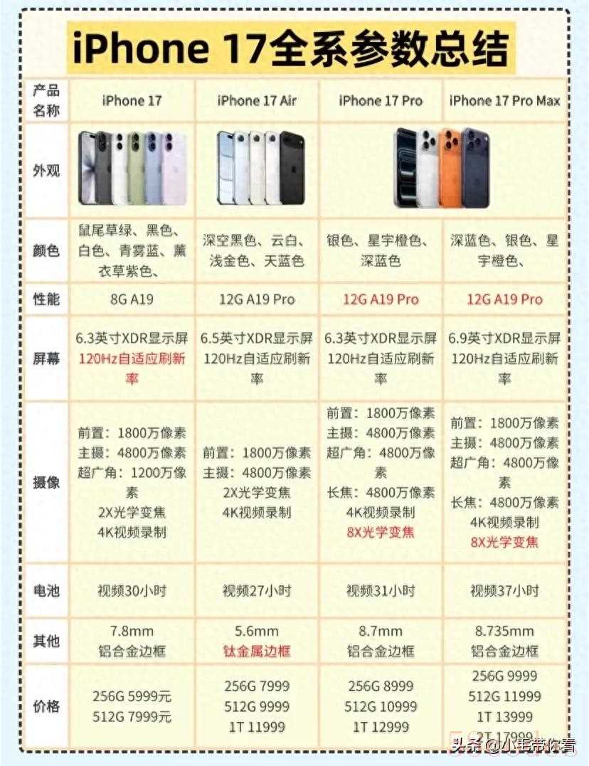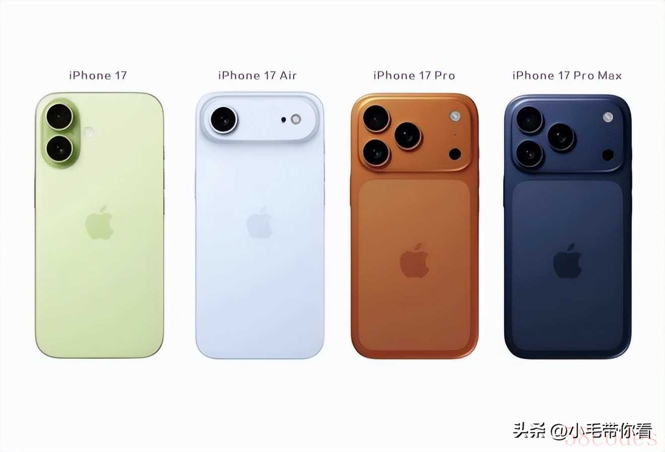 iPhone 17系列在设计上呈现两大趋势。Pro系列采用铝金属框架替代钛金属,并采用横向排列的“相机条”设计取代传统凸起模组。