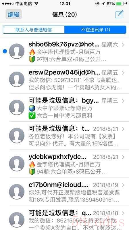 近日,不少使用苹果手机的市民收到iMessage垃圾信息,内容涉及博彩、高仿商品、开发票,甚至还有一些黄色文章。有用户一天收到三四条,还有半夜两点收到垃圾信息的。尽管对这种情况进行了投诉,但垃圾信息并没减少,用户还不能拒收。苹果手机收到的大量垃圾信息,给用户带来了麻烦。