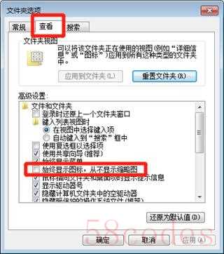 然后在新窗口中选择“查看”,然后将选项“始终显示图标,从不显示缩略图”前面的对勾去掉,根据以往的经验,点击应用再点确定就可以了。