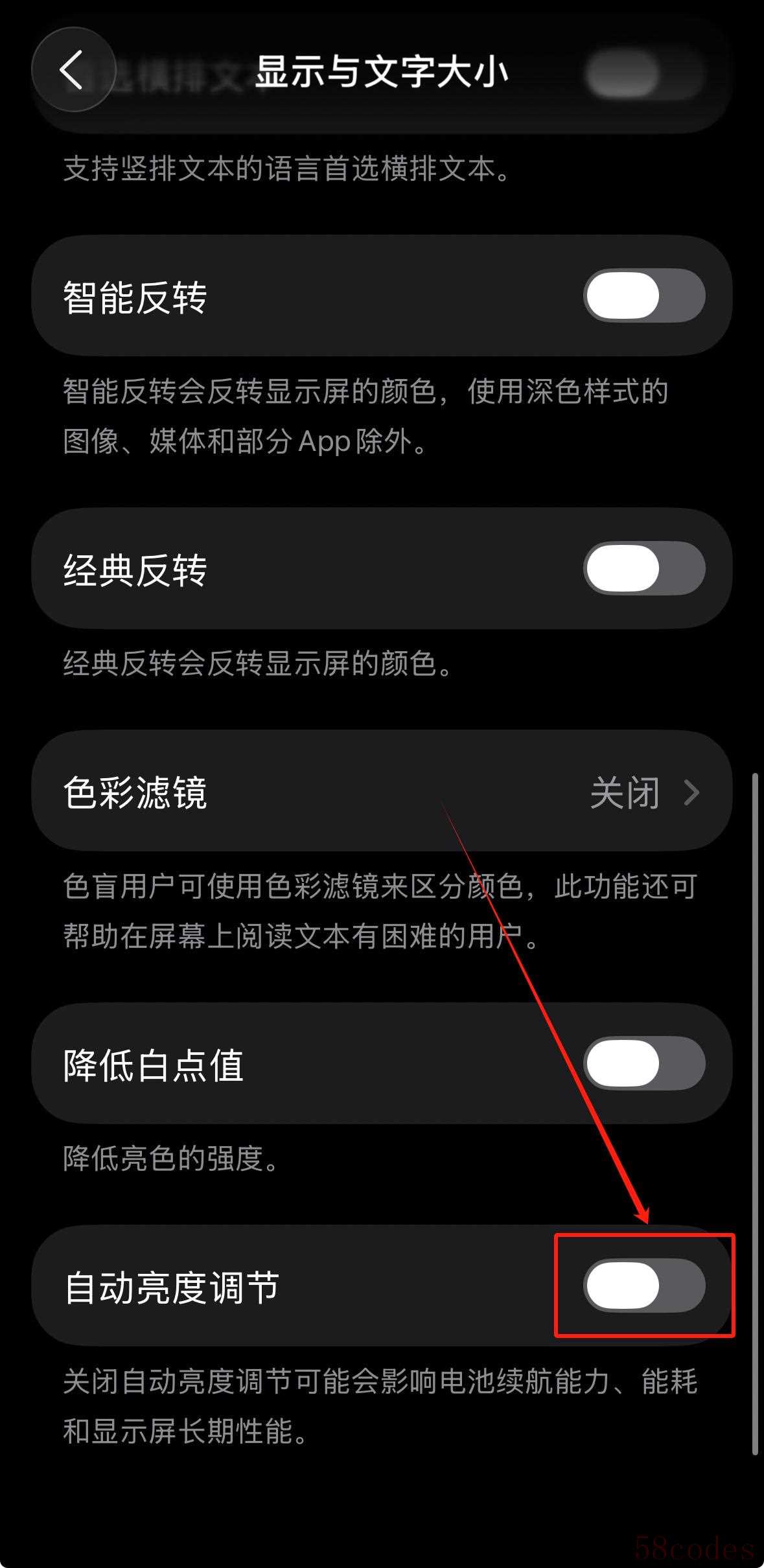 我们可以选择性地打开或者关闭“自动亮度调节”后的滑动开关选项;需要注意的是此功能可能会影响我们的电池续航能力、能耗以及显示屏长期性能等方面。
