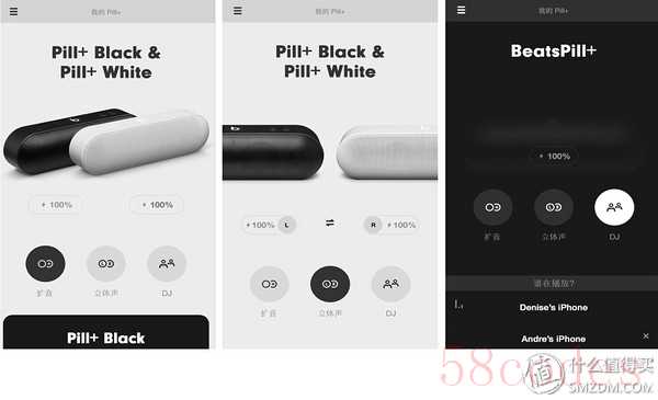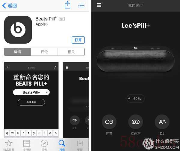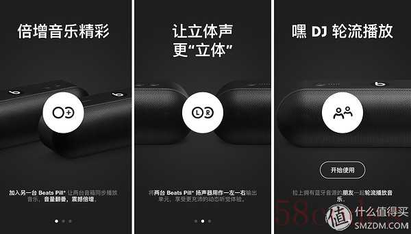 Beats在 iOS 和 Android平台都推出了Beats Pill+ APP,除了查看音箱电量、连接状态和更改蓝牙名称基本操作外,还有三种拓展模式,即1.扩音模式,可连接两台设备实现音量翻倍,也就是串联起来的意思;2.立体声模式,将同时连接的两台设备分别作为左右输出单元,实现增大声场的效果,也就是并联;3.DJ模式,是将两个设备同时连接Beats Pill+,实现轮流播放音乐。个人感觉这些用处噱头大一些,一般用不到。