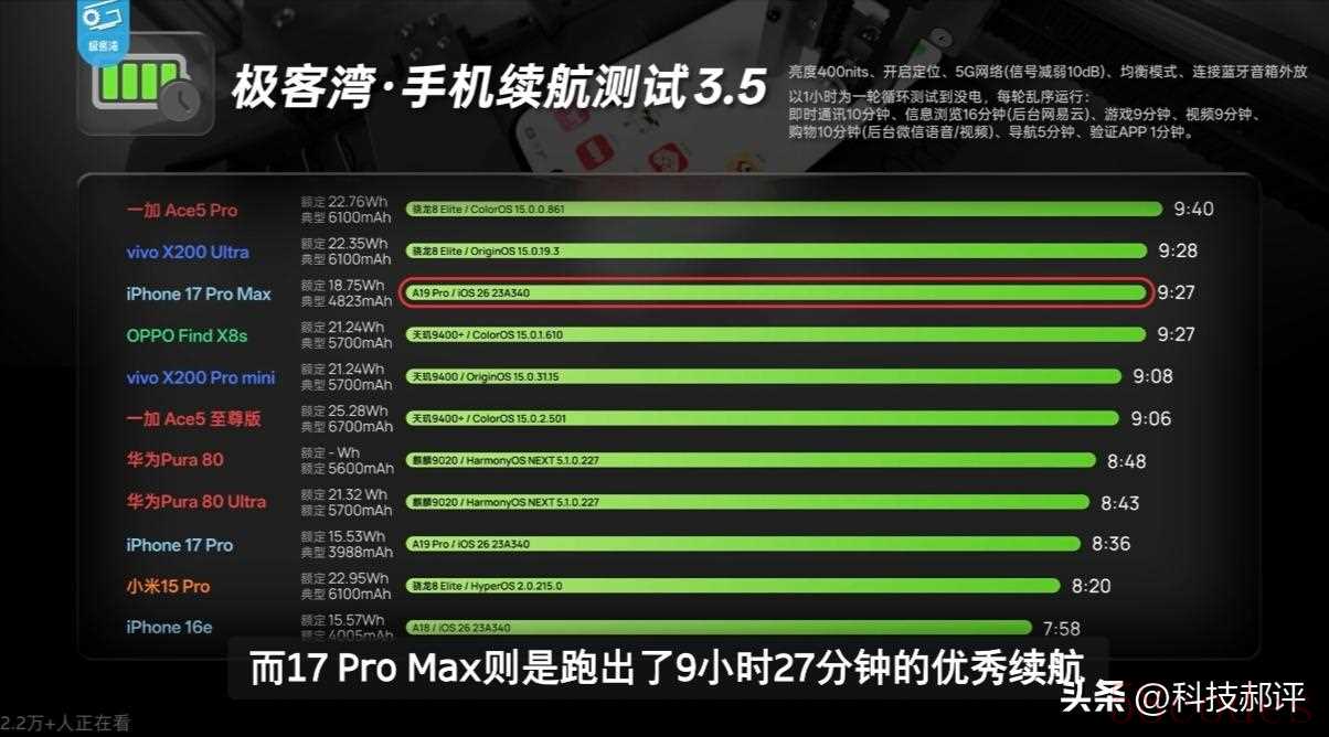 通过极客湾·手机续航测试3.5模型(亮度400nits、5G网络信号减弱10dB、多场景循环测试)显示,结果iPhone 17 Pro Max扛了9小时27分钟,和一加、vivo的安卓旗舰续航差不多能打,苹果这回续航算是拿出手了。