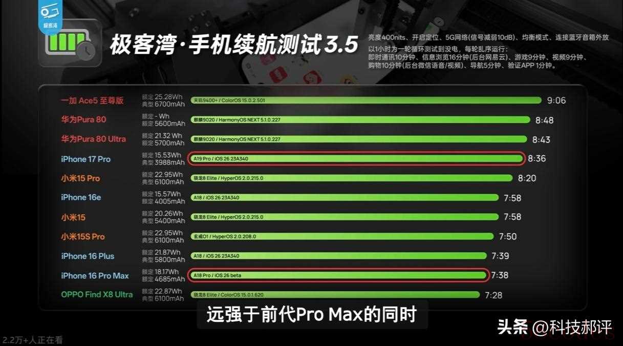 iPhone 17 Pro的8小时36分钟,比去年16 Pro的6小时16分钟硬生生多了2小时20分钟。