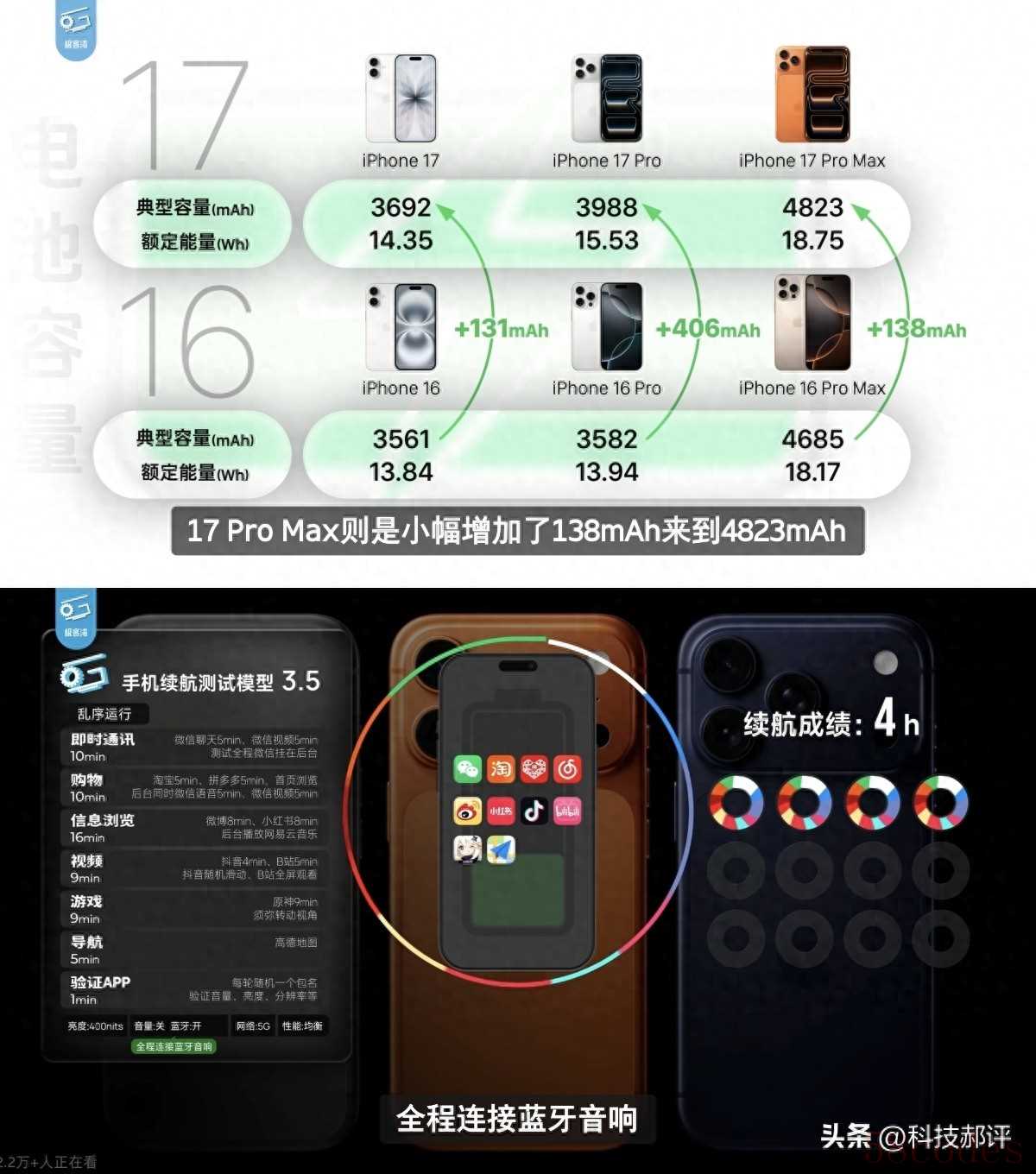 iPhone 17 Pro Max电池容量4823mAh,虽仅比前代+138mAh,但A19 Pro的能效优化让每毫安时续航能力提升15%。