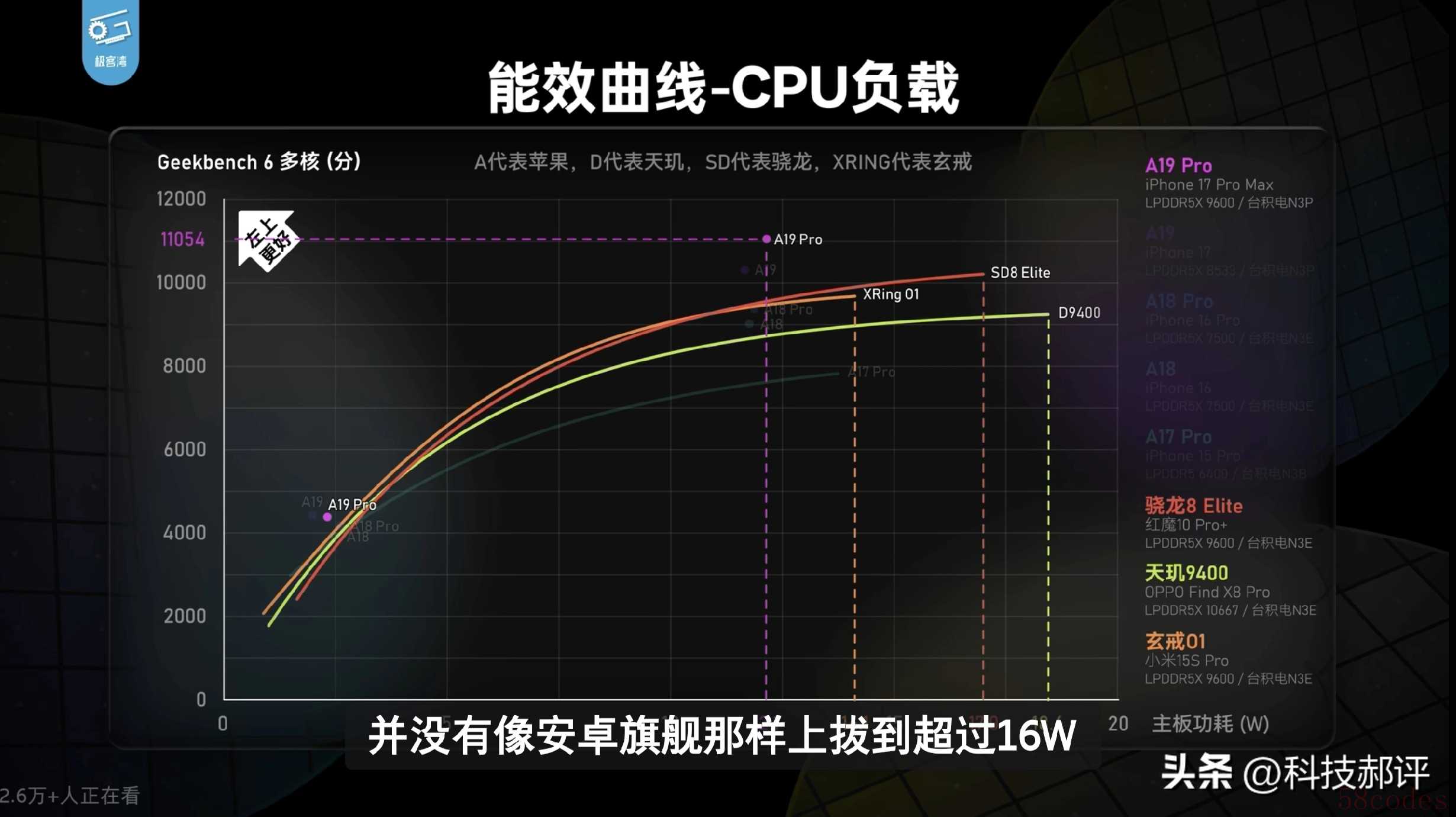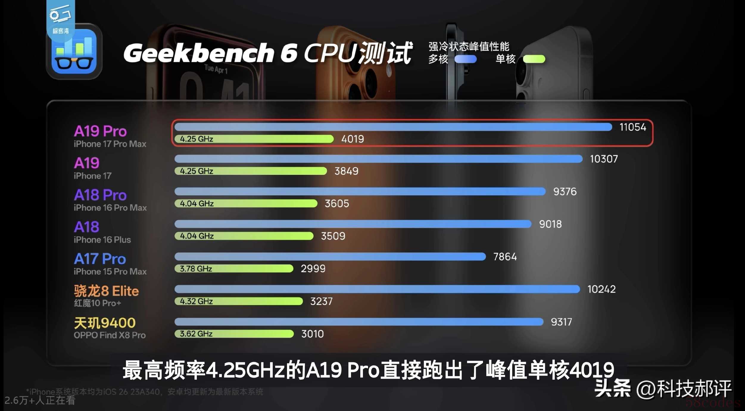 A19 Pro单核很拔尖,超越目前所有的处理器,包括电脑处理器,多核性能目前第一,苹果还是一如既往的能效之王。