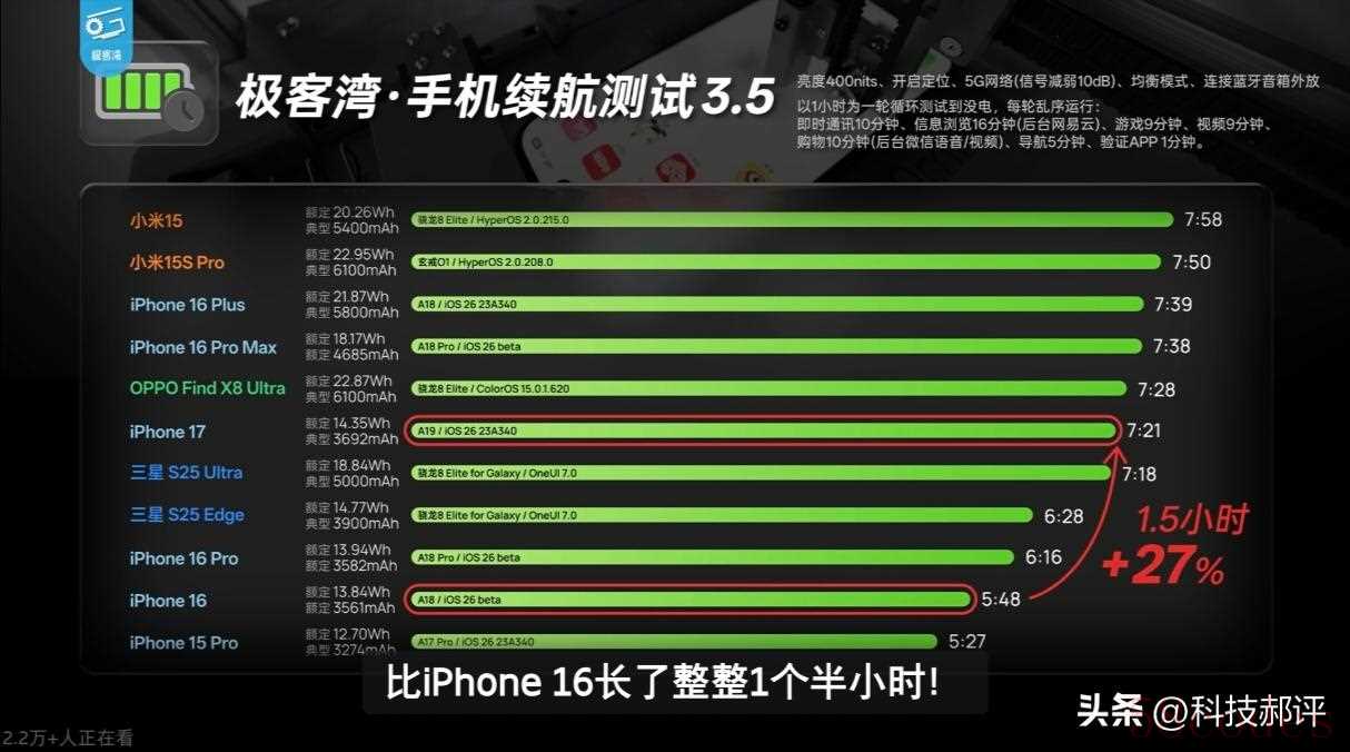 iPhone 17的7小时21分钟,也比iPhone 16的5小时48分钟长了 1.5 小时。