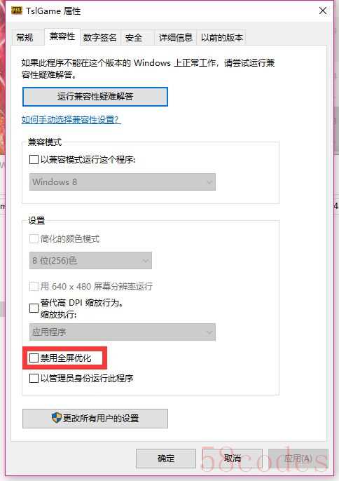 在确定卡顿跟平台性能和游戏设置无关之后,只要找到《绝地求生》的exe运行文件,点击右键打开“属性”界面,在“兼容性”标签下将“禁用全屏优化”打上勾,再进入游戏之后,你就会发现画面一点都不卡了。
