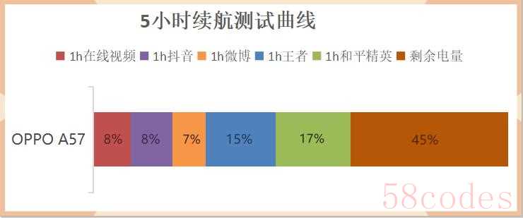 既然是智能手机,绕不开的肯定还有它的续航表现。OPPO A57配备了一块5000mAh的大电池,从具体使用情况来看,大电池的续航优势还是非常明显。我们普通人使用手机的场景一般就是看视频、文字、游戏这些,于是我们就选择了1h的在线视频播放、1h的抖音、1h的微博、1h的王者荣耀和1h的和平精英,作为对OPPO A57的续航测试。