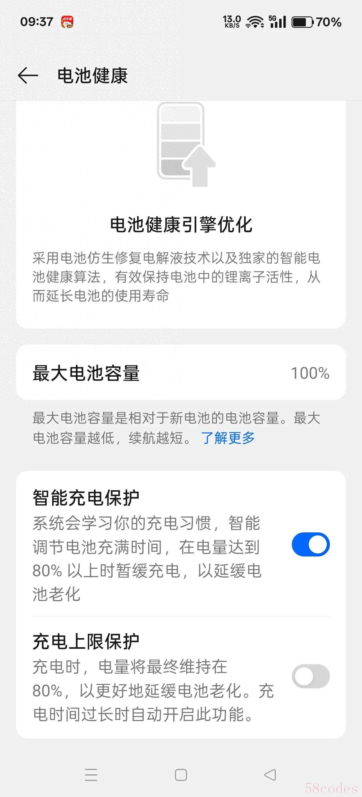 首先打开设置找到电池选项,打开电池健康度可以看到几个选项,打开智能充电选项,可以延缓电池老化。如果你对电池健康度要求更高也可以打开充电上限选项,这样手机电池将一直维持在80%,能更好的保护电池,不过续航也会相应的缩短。