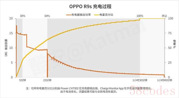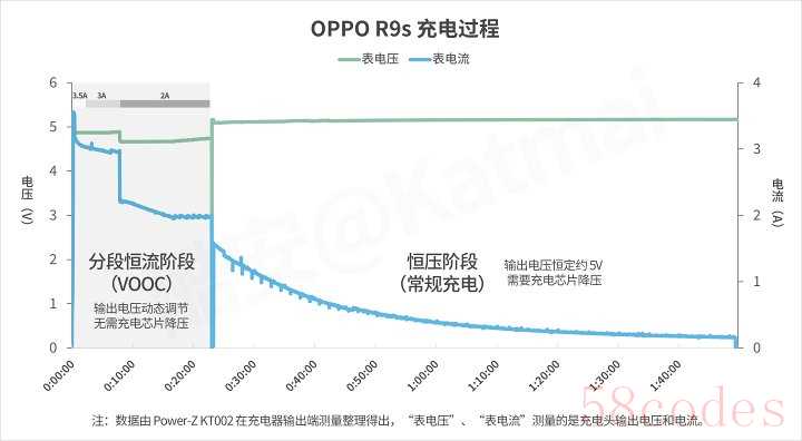 为了彻底弄清楚VOOC,我自购了一台2016年发布的 OPPO R9s 手机,使用手机App(Charging Monitor)记录和外接Power-Z KT-002电流表两者同步测量的方式,测量手机从1%充到满电状态的全过程,记录下各自的电压、电流、电量变化以及手机的温度。