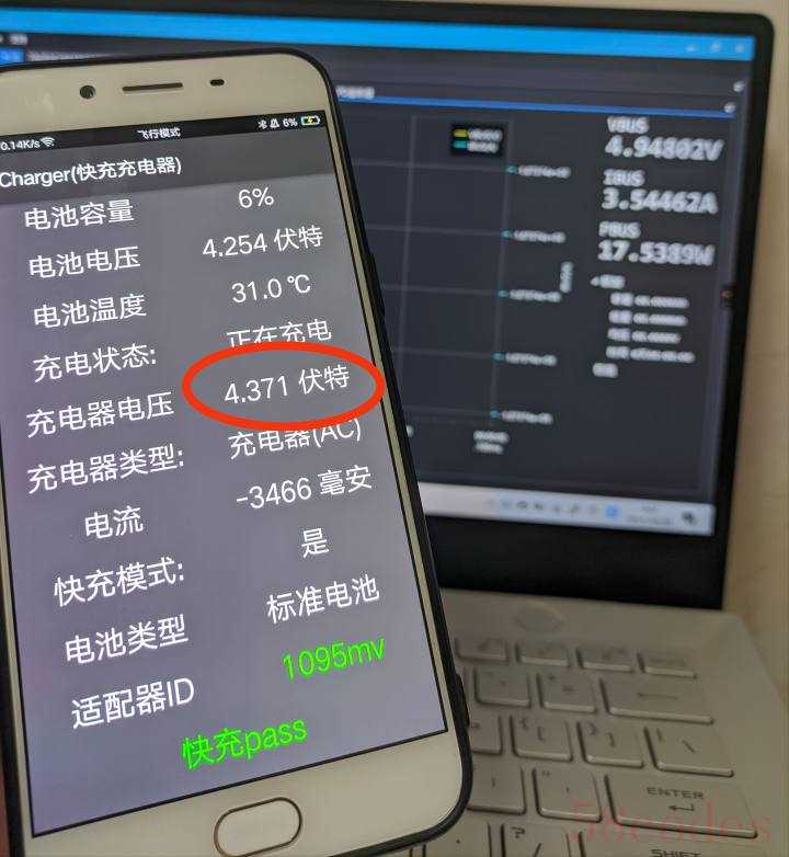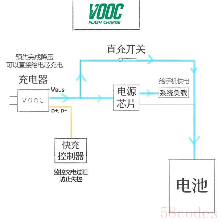 这样一来,VOOC闪充的原理就能说得通了:通过包含定制芯片的充电头配合魔改的数据线,使得充电头最大能输出4A左右的电流,到了手机后,电流分成两路,给手机电池充电,这样就能实现理论最大22.5W的快充。