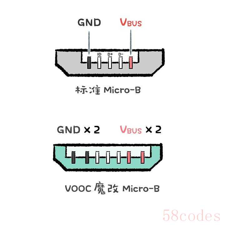 正常情况下, Micro-USB接口一共有五个引脚(pin),其中四个对应我们的老朋友:VBus(电源总线)、GND(地线)、D+和D-(数据线),还有一个ID引脚,用来给OTG识别设备类型。
