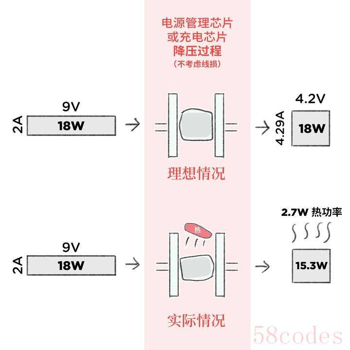 假设一颗充电芯片的降压效率为85%,如果给它输入18W功率,那么只有接近18*85%=15.3W的功率进入电芯,而剩余的18-15.3=2.7W左右的功率,只能以热量的形式白白耗散,更糟糕的是,这每秒2.7焦耳的热量堆积在机身,导致手机十分烫手。